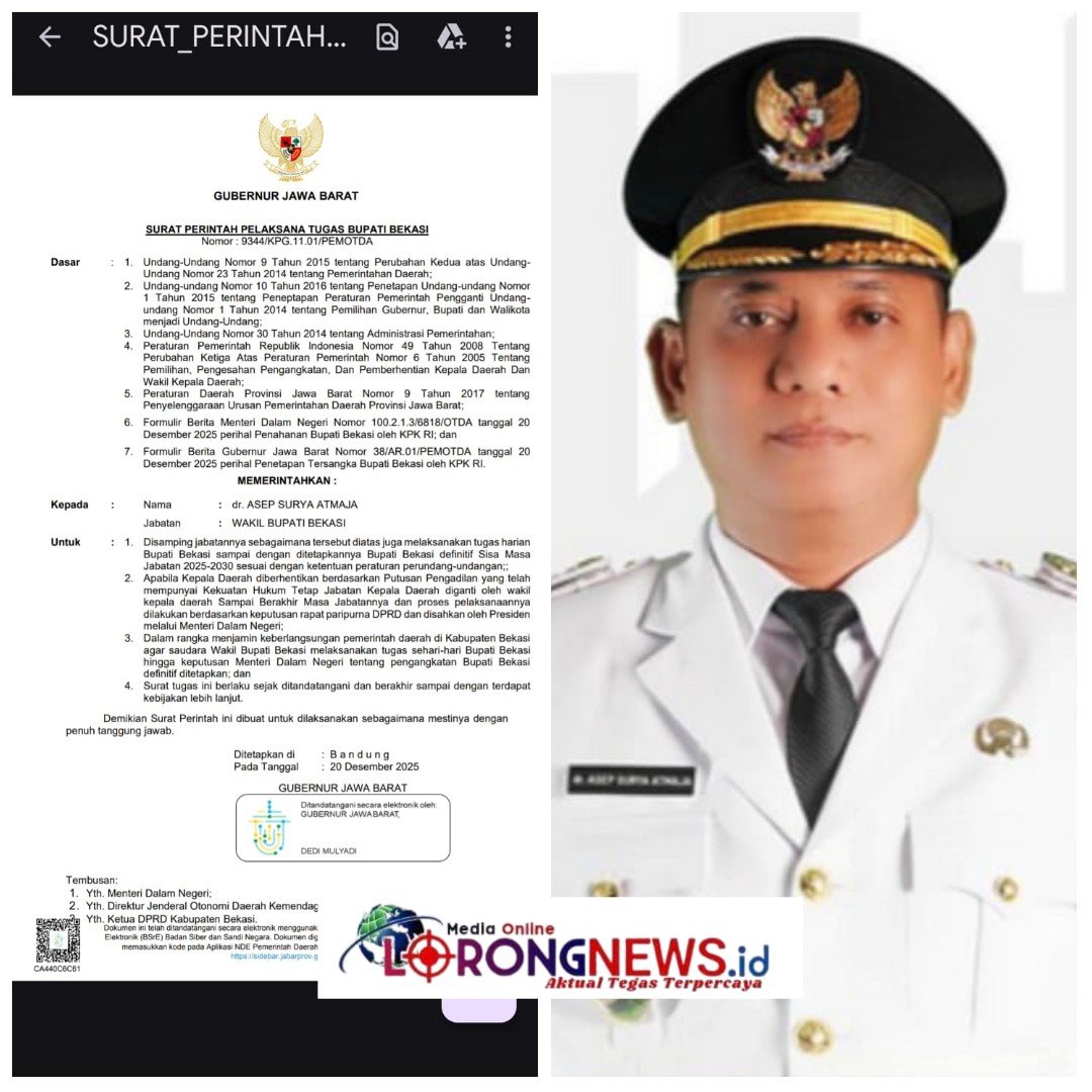 BEKASI, LORONGNEWS.id – Pemerintahan Kabupaten Bekasi memasuki babak baru. Di tengah guncangan politik akibat penahanan Bupati Bekasi oleh Komisi Pemberantasan Korupsi (KPK), Gubernur Jawa Barat Dedi Mulyadi resmi menunjuk Wakil Bupati dr. Asep Surya Atmaja sebagai Pelaksana Tugas (Plt) Bupati Bekasi.