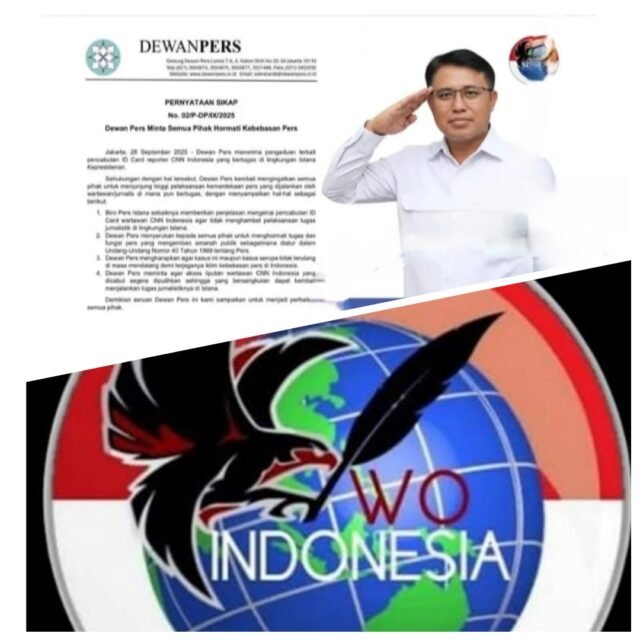 JAKARTA, LORONGNEWS.id – Dewan Pers menerima pengaduan terkait pencabutan ID Card reporter CNN Indonesia yang bertugas di lingkungan Istana Kepresidenan. Menyikapi hal tersebut, Dewan Pers mengeluarkan pernyataan sikap No. 02/P-DP/IX/2025 pada Minggu (28/9/2025).