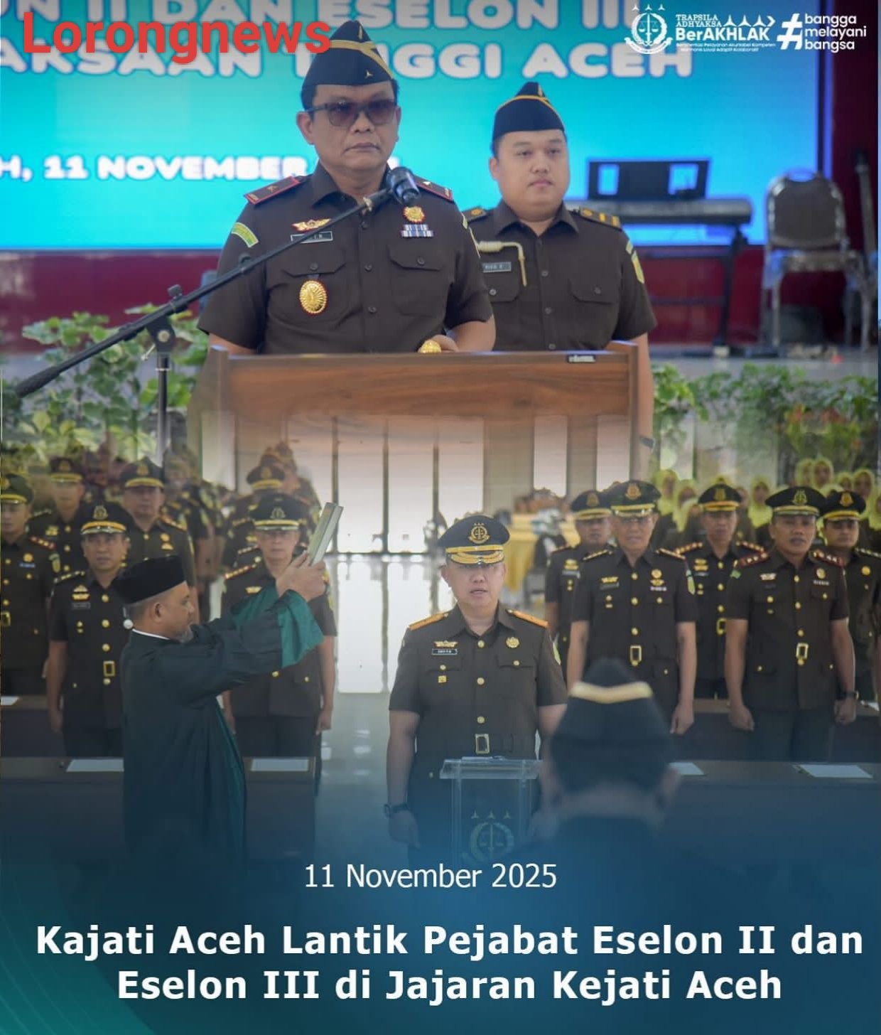 ACEH, LORONGNEWS.id – Kepala Kejaksaan Tinggi Aceh, Yudi Triadi, S.H., M.H., memimpin langsung upacara pengambilan sumpah, pelantikan, dan serah terima jabatan pejabat eselon II dan eselon III di lingkungan Kejaksaan Tinggi Aceh, Senin (11/11/2025), bertempat di Aula Kejati Aceh, Banda Aceh.