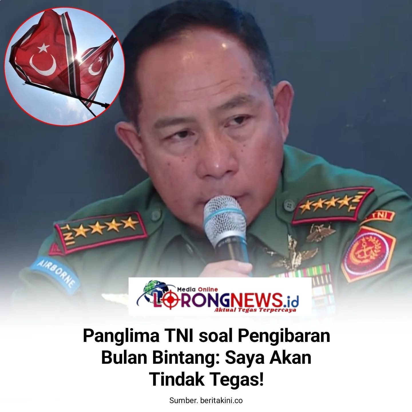 JAKARTA, LORONGNEWS.id – Panglima TNI Jenderal Agus Subiyanto menegaskan tidak akan mentoleransi pengibaran bendera bulan bintang di tengah situasi bencana yang melanda Aceh.