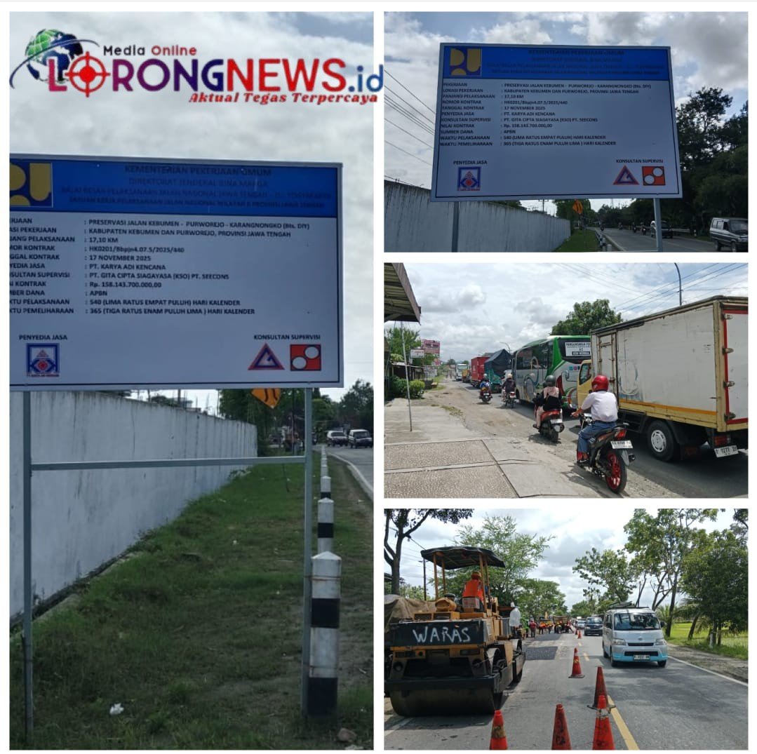 KEBUMEN, LORONGNEWS.id – Senin 1 Desember 2025 – Jalan Nasional di Jawa Tengah, khususnya ruas Kebumen–Purworejo, kembali menjadi sorotan. Sebuah papan proyek besar terpampang, mengumumkan dimulainya pekerjaan Preservasi Jalan Kebumen – Purworejo – Karangnongko (Bts. DIY) senilai fantastis Rp 158.143.700.000,00.