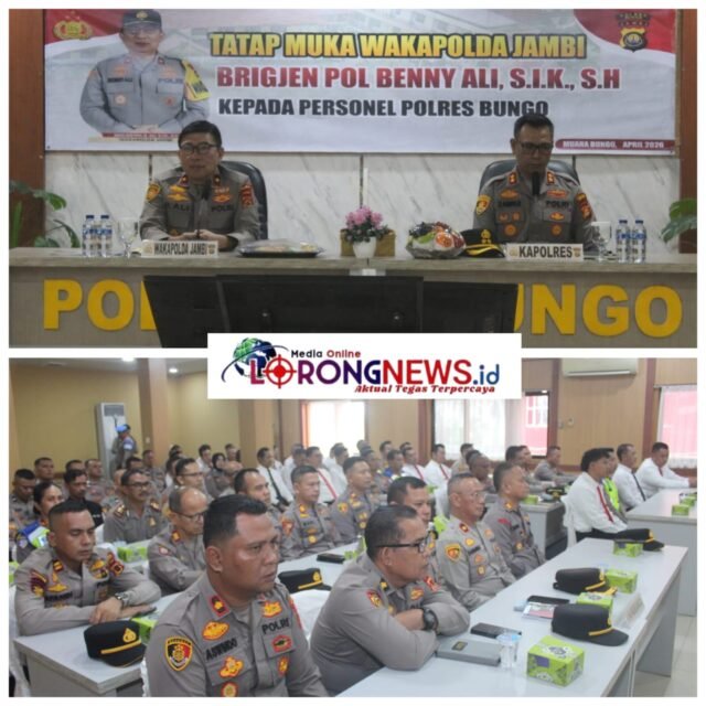 BUNGO, LORONGNEWS.id – Wakapolda Jambi Benny Ali, S.I.K., S.H berkunjung ke Mapolres Bungo, Senin (13/4/2026), dalam rangka memberikan arahan langsung kepada seluruh personel Polres Bungo. Kegiatan yang digelar di Aula Tatag Trawang Tungga ini dihadiri jajaran pejabat utama Polda Jambi, Kapolres Bungo Zamri Elfino. S.I.K para pejabat utama, kapolsek jajaran, serta personel Polres Bungo.